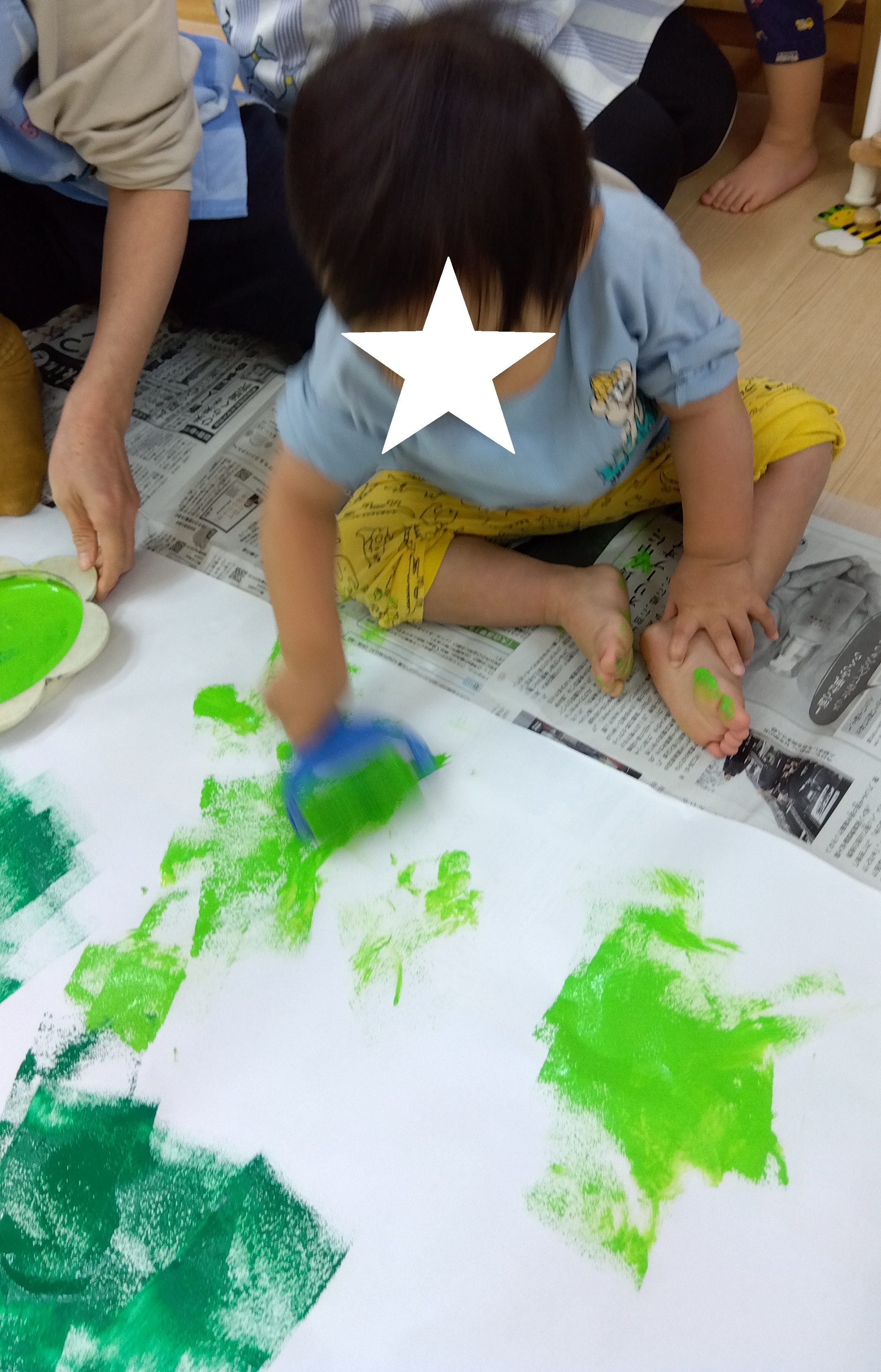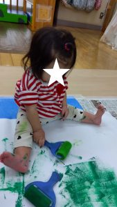コロコロ転がして色が付く様子や、手足に絵の具がついた感触を不思議そうにしたり楽しみながら行っていました!