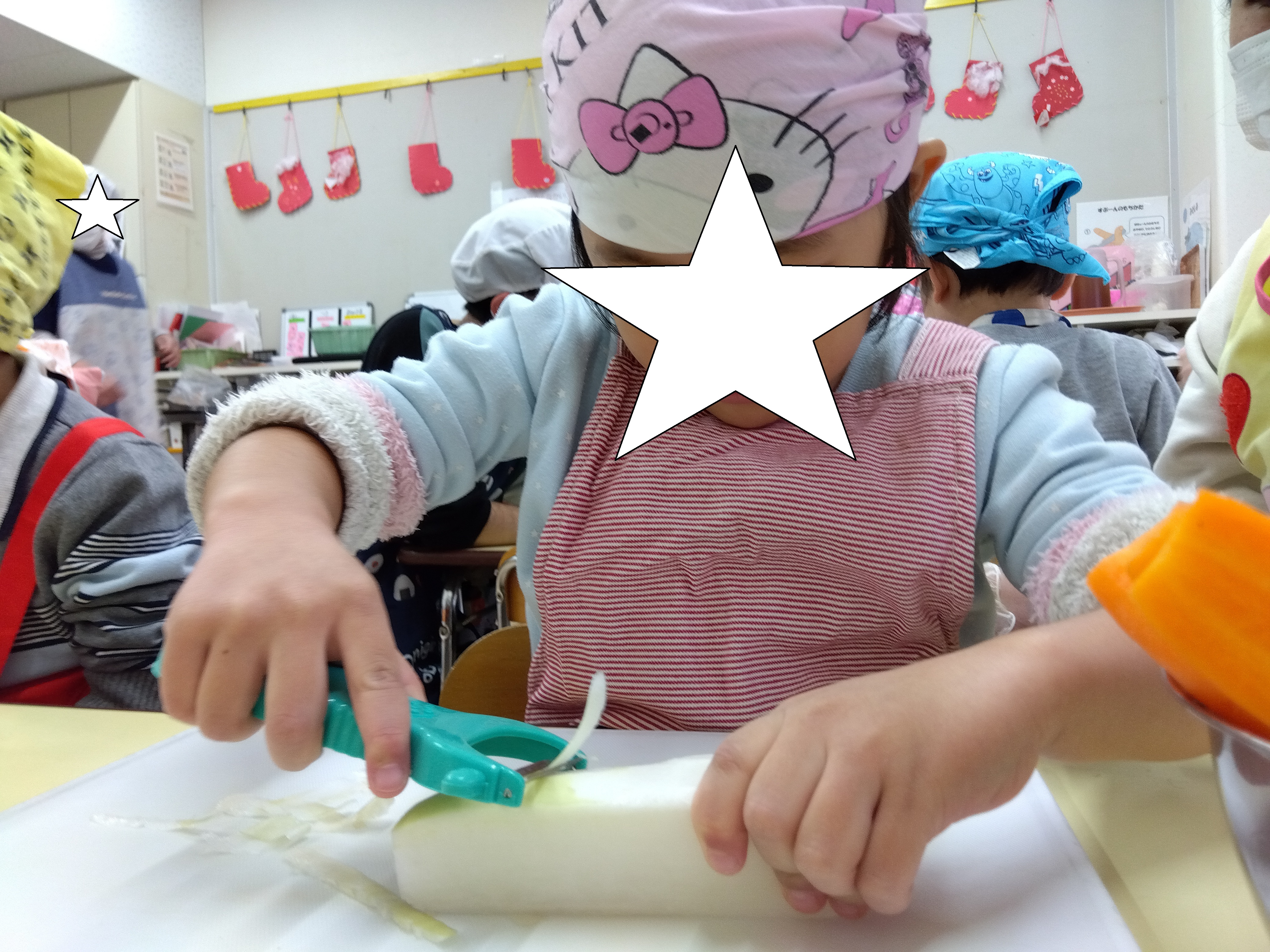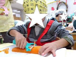 以前、ニンジンと大根の皮むきをおこなったので、つき組の子ども達はピーラーの使い方を知っており、とても上手に使うことができていましたよ。