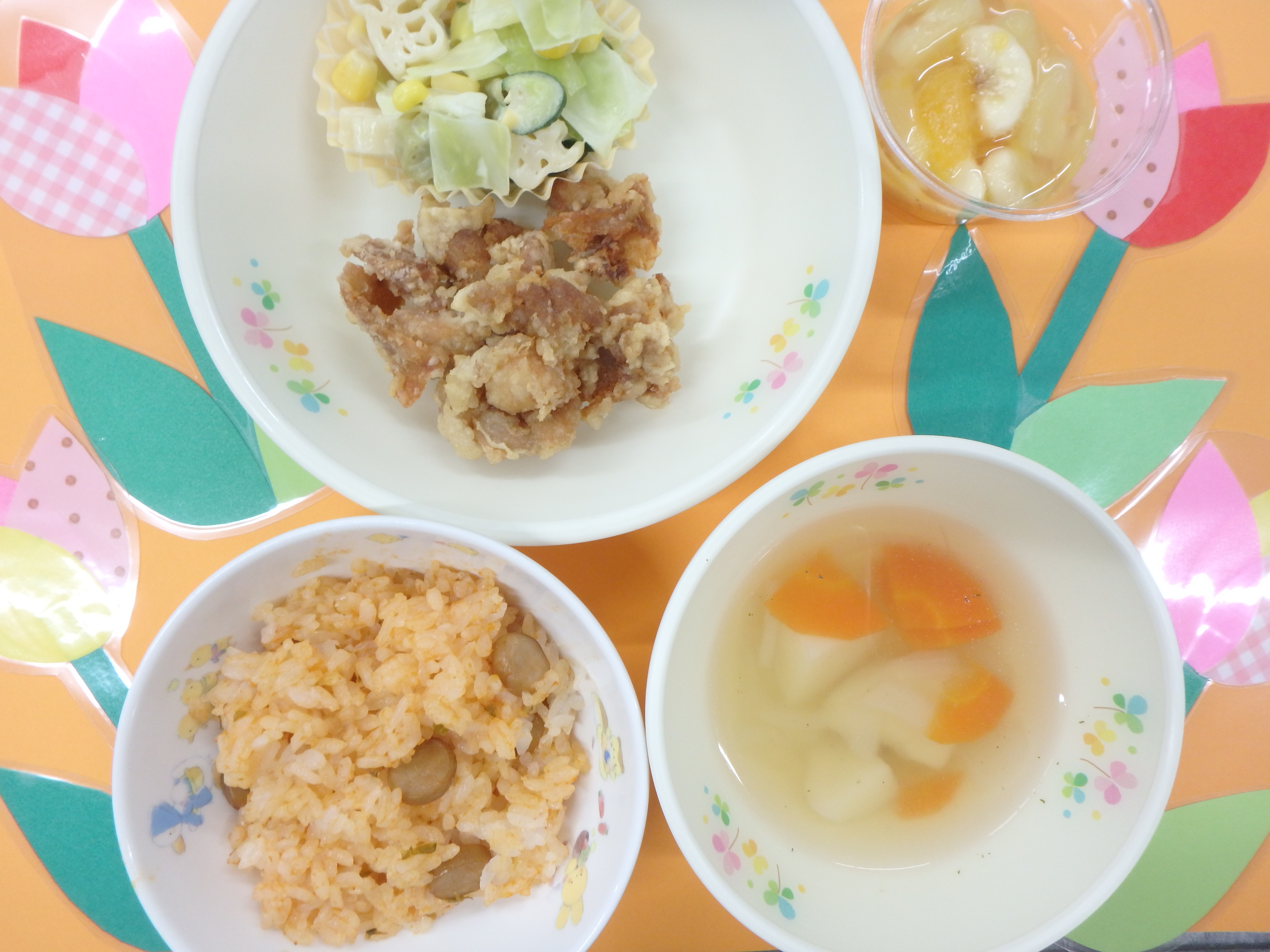 保育園ではひなまつり会が行われ、給食もひなまつり献立になっています。
