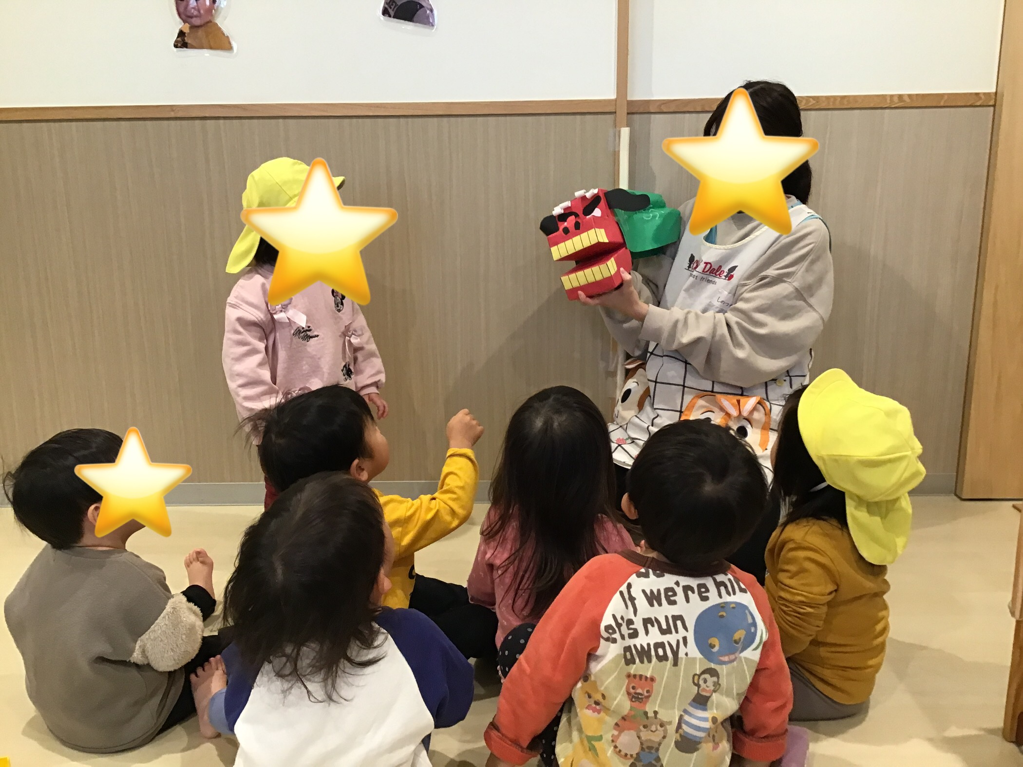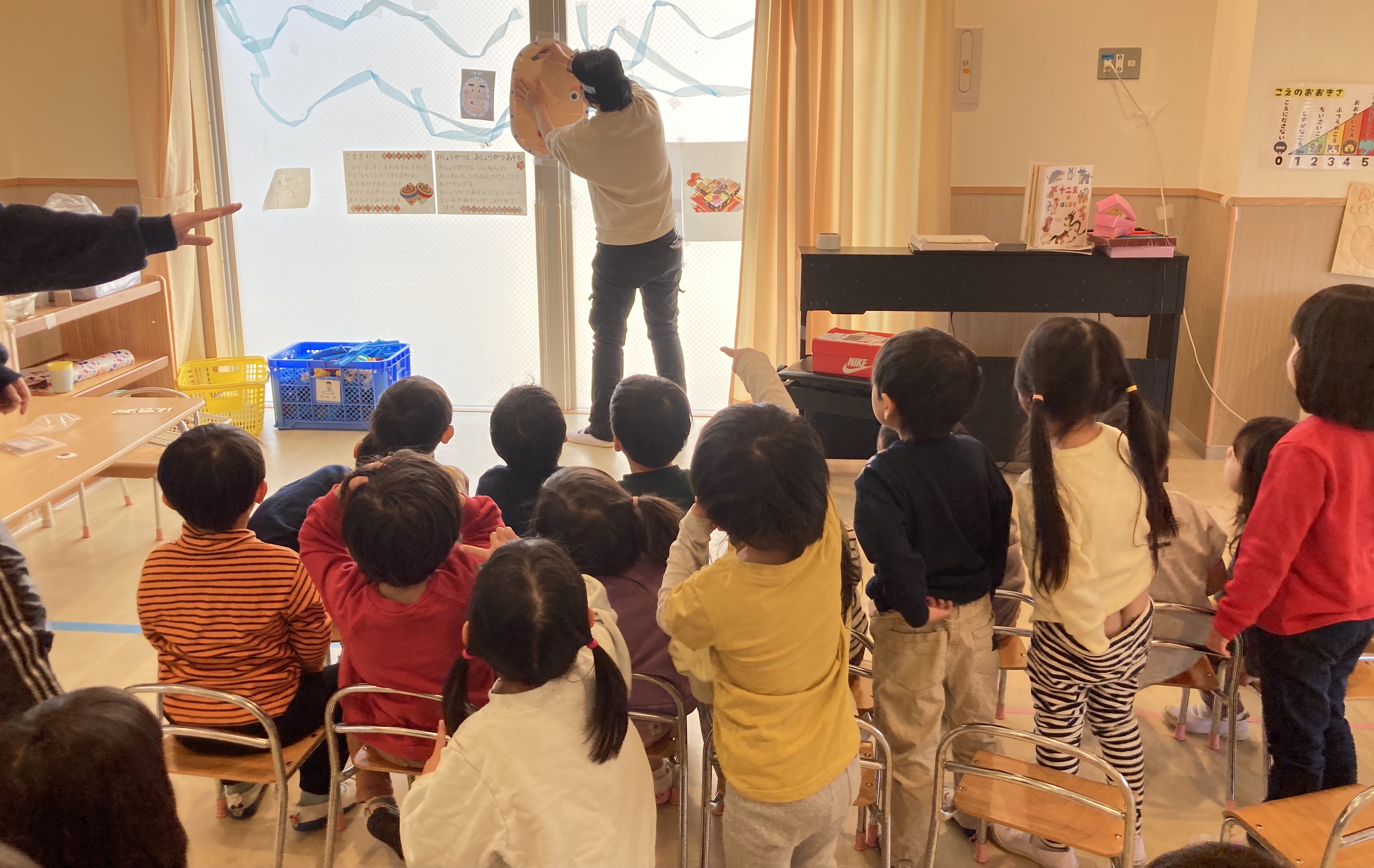0歳児のクラスはサンタさんのペープサートに興味津々!
