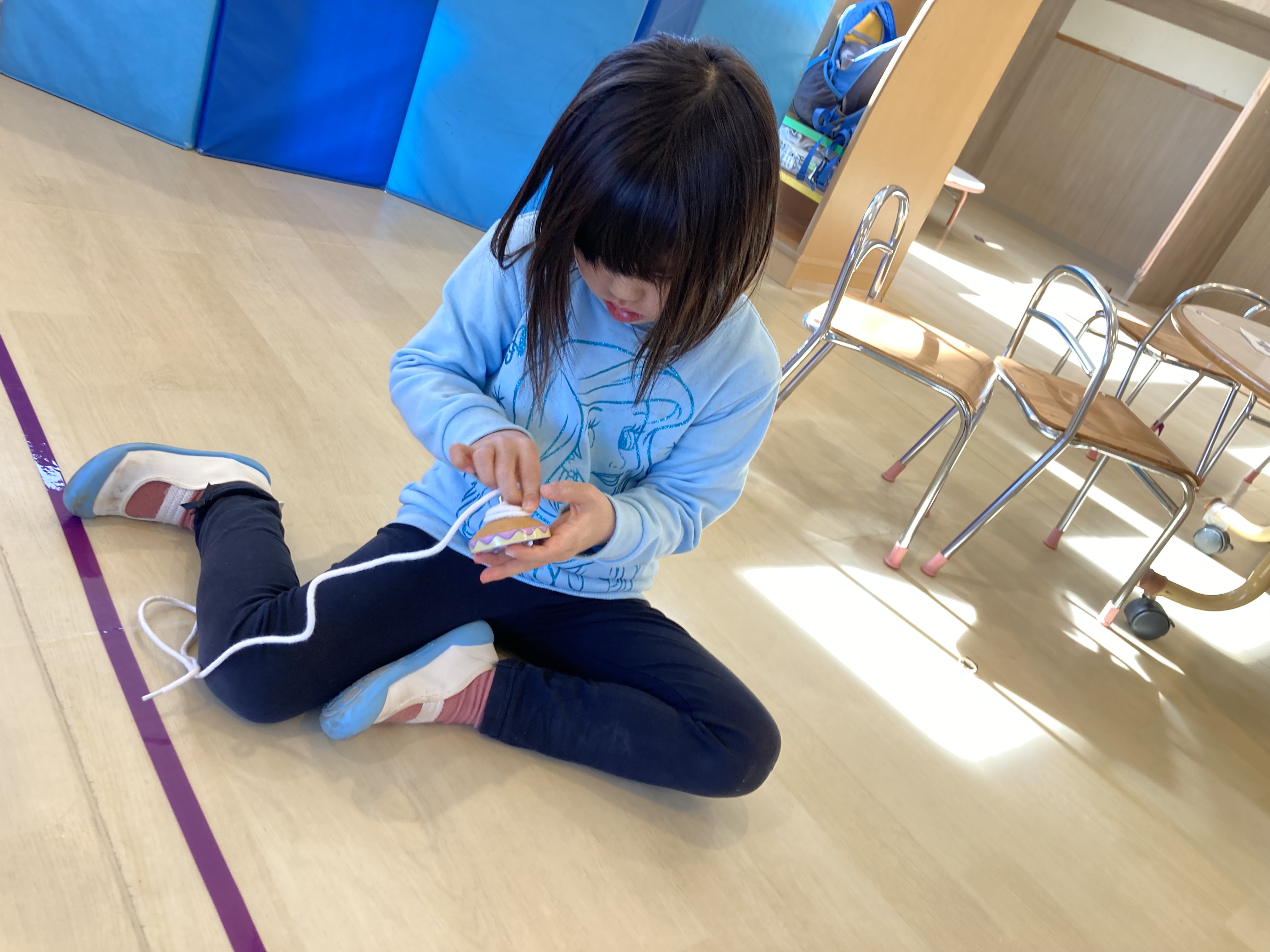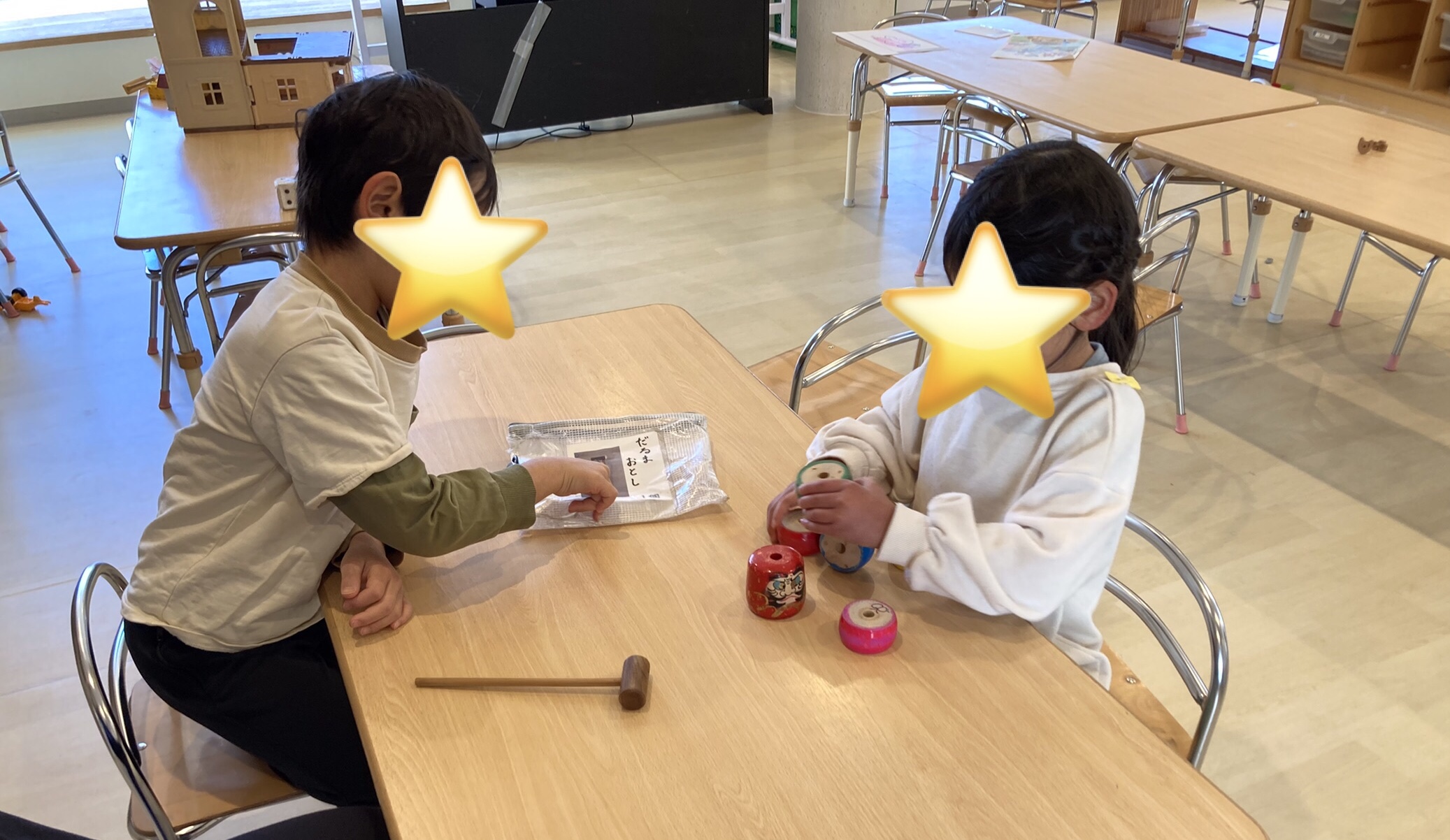 投げゴマは最初ができる子もいれば、なかなかコマの糸を巻くことが苦戦している子もいました。
