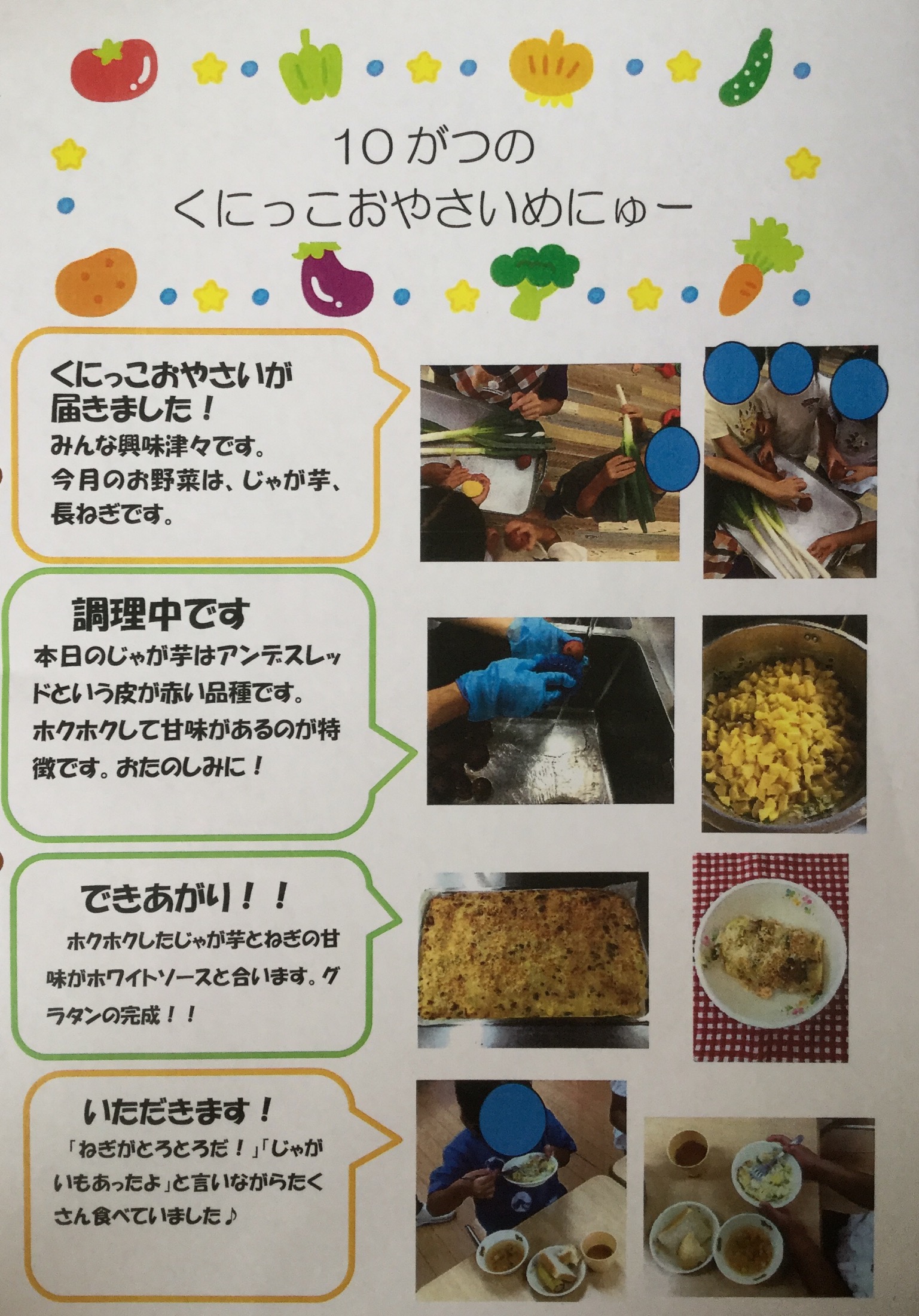 子どもたちは、「長ネギがとろとろだね!」「じゃがいもあったよ!」と野菜を探しながら食べていました♪ 栄養士が今日のじゃがいもはどんなお芋だったかな?と聞くと、「赤い色だった!」と教えてくれました。 今後も野菜を身近に感じられるような取り組みをしていきます。