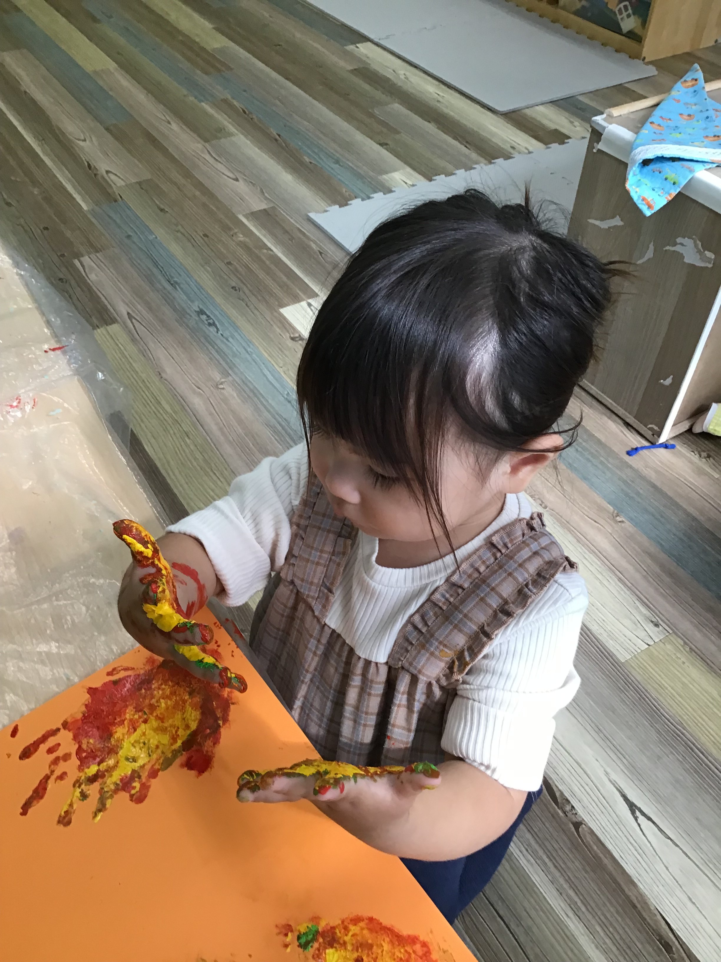 今回は手指に付けた絵の具を自由に色画用紙にペタペタ、ちょんちょんと表現遊びを楽しみました。