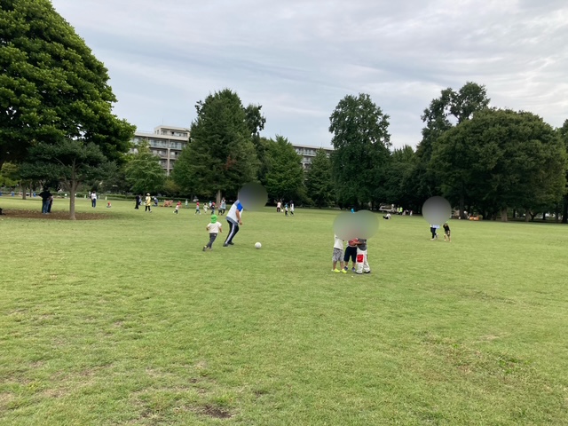 公園の真ん中には大きなサルスベリの樹があり、木の実や花がたくさん落ちていていました。砂遊びではその木の実や花を食べ物に見立て、「ごはんどーぞ!」「パイナップル!」と遊びが広がっていました。