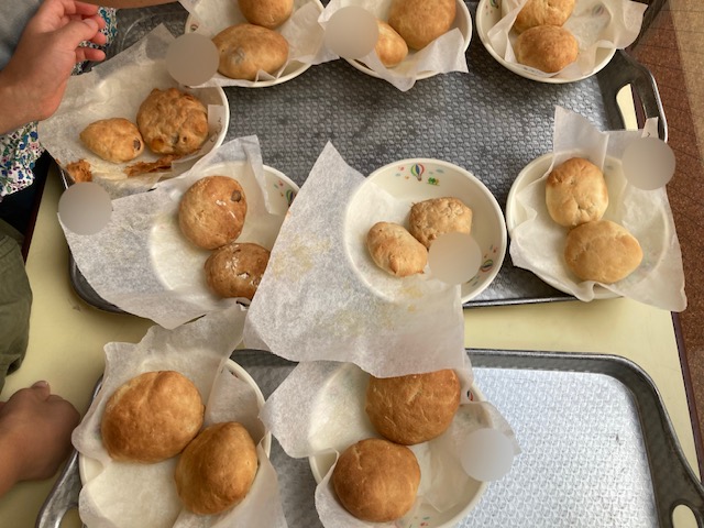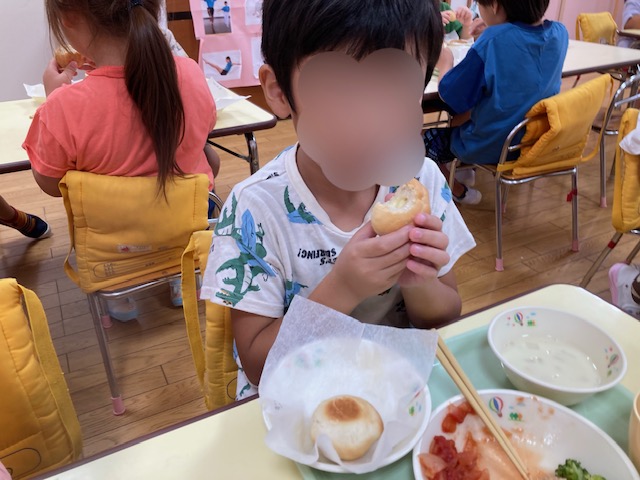 昼食の時間に焼き上がったパンを持ってきてもらうと、「早く食べたい!」と待ちきれない様子でした!!順番にパンをもらうと、素敵な笑顔でした。