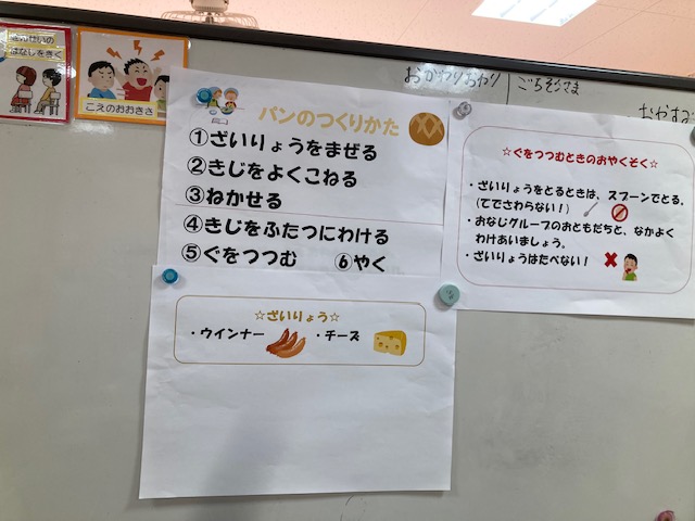 材料を入れ終わったら、調理の先生に渡し、焼いてもらいました。「パンどうなったかな」「パン焼けたかな?」とドキドキした様子でパンが焼けるのを待っていました。