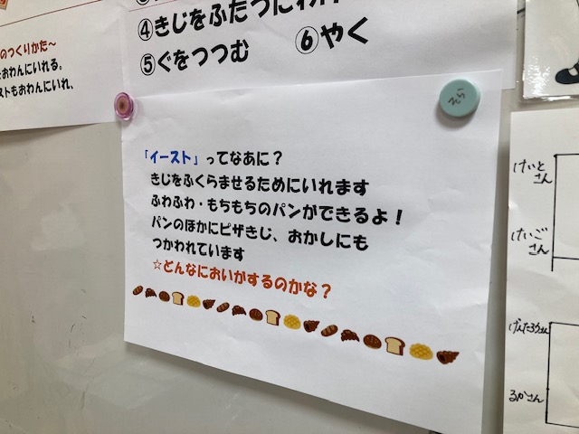 まずは調理の先生からパンの作り方を教えてもらいました。「イーストってみんな聞いたことあるかな?」と聞かれると「聞いたことある!」と答えていました。