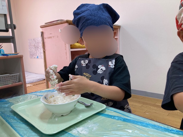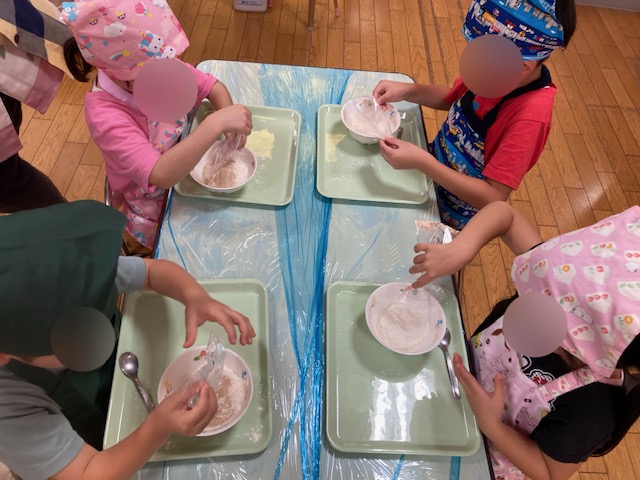 「今日はパン作りだよ!」と嬉しそうに登園してきた空組のお友達。