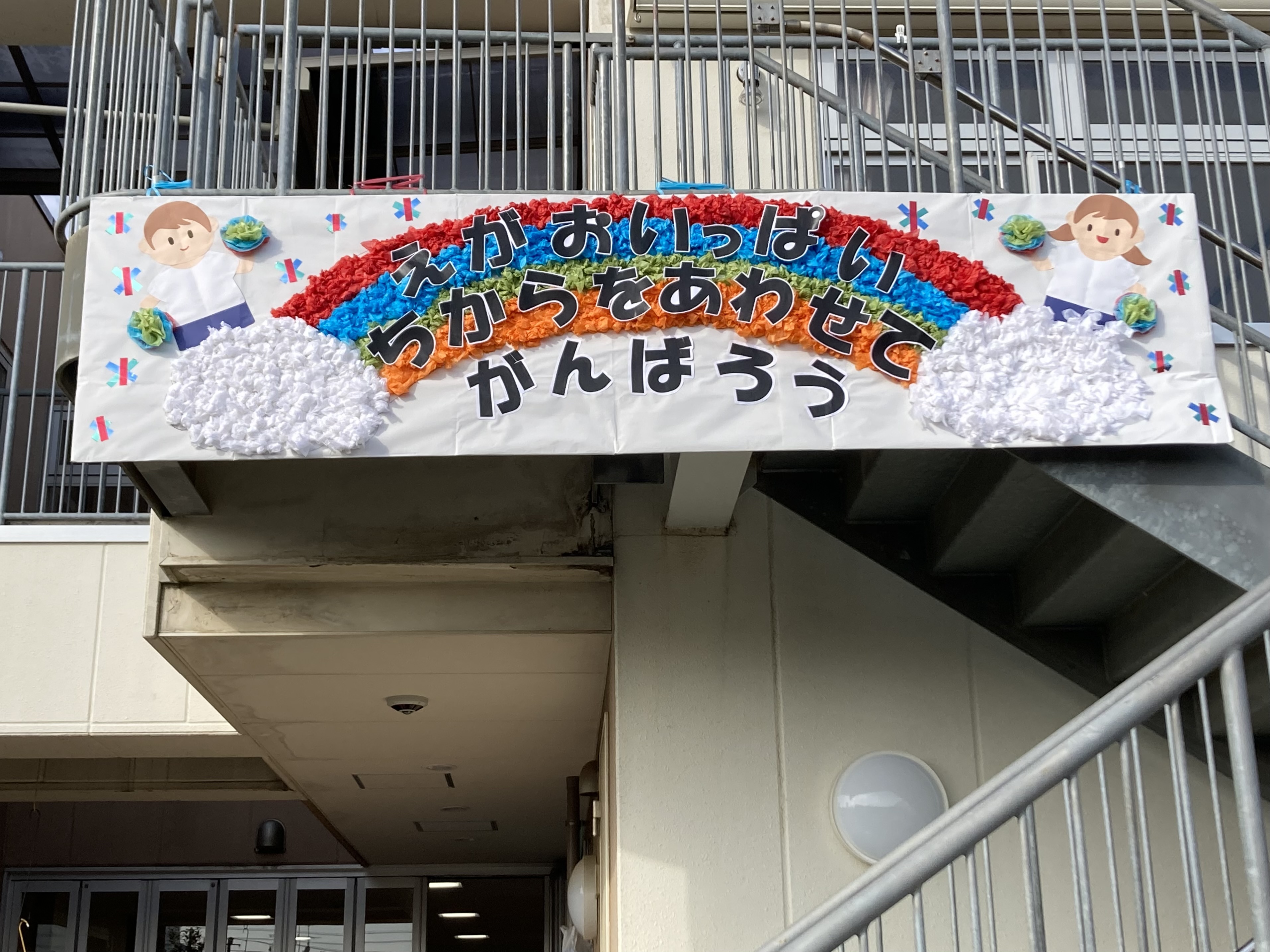 今年のスローガン「えがおいっぱい ちからをあわせてがんばろう」は空組(5歳児)の子どもたちが話し合って決めました。