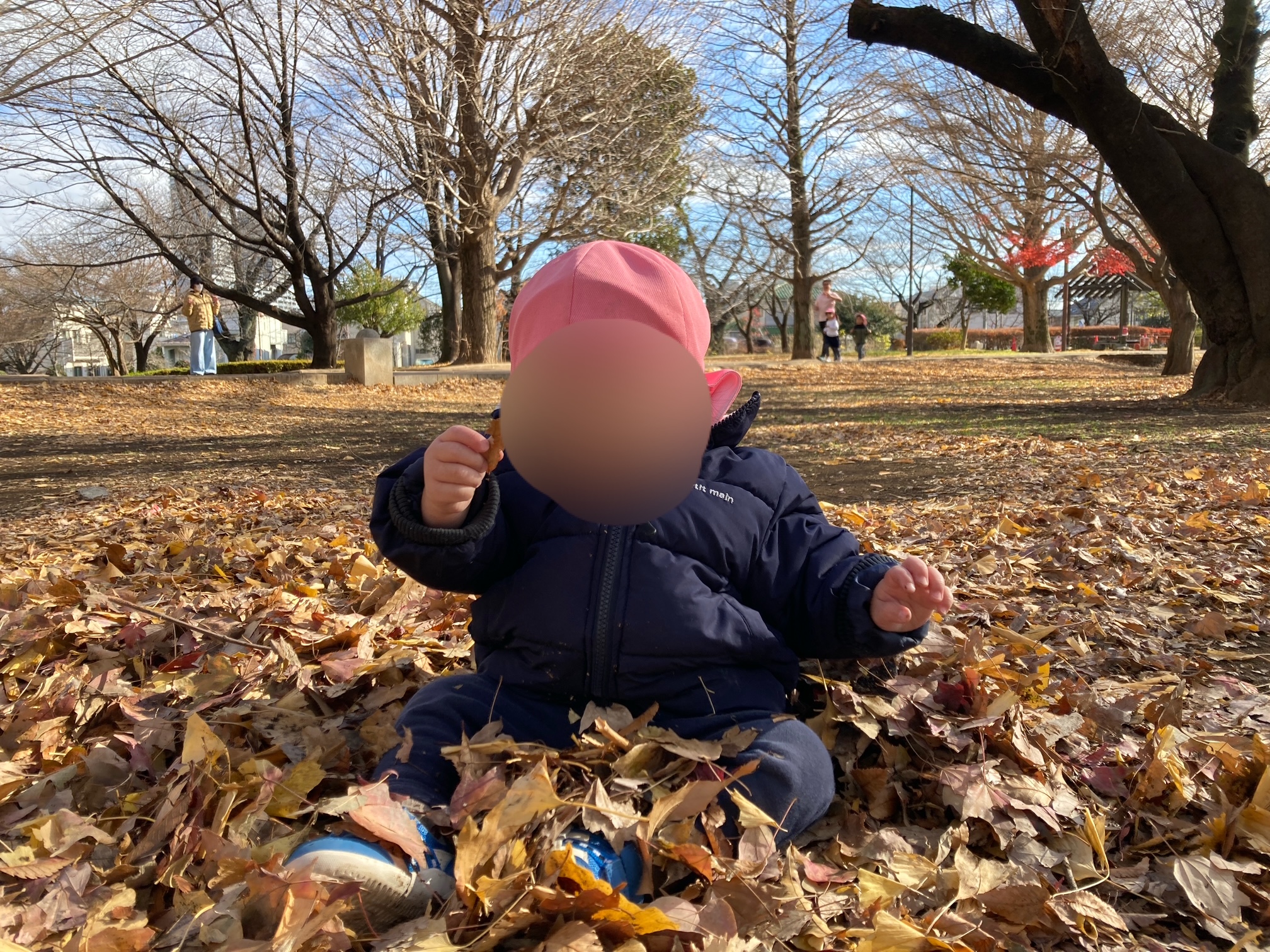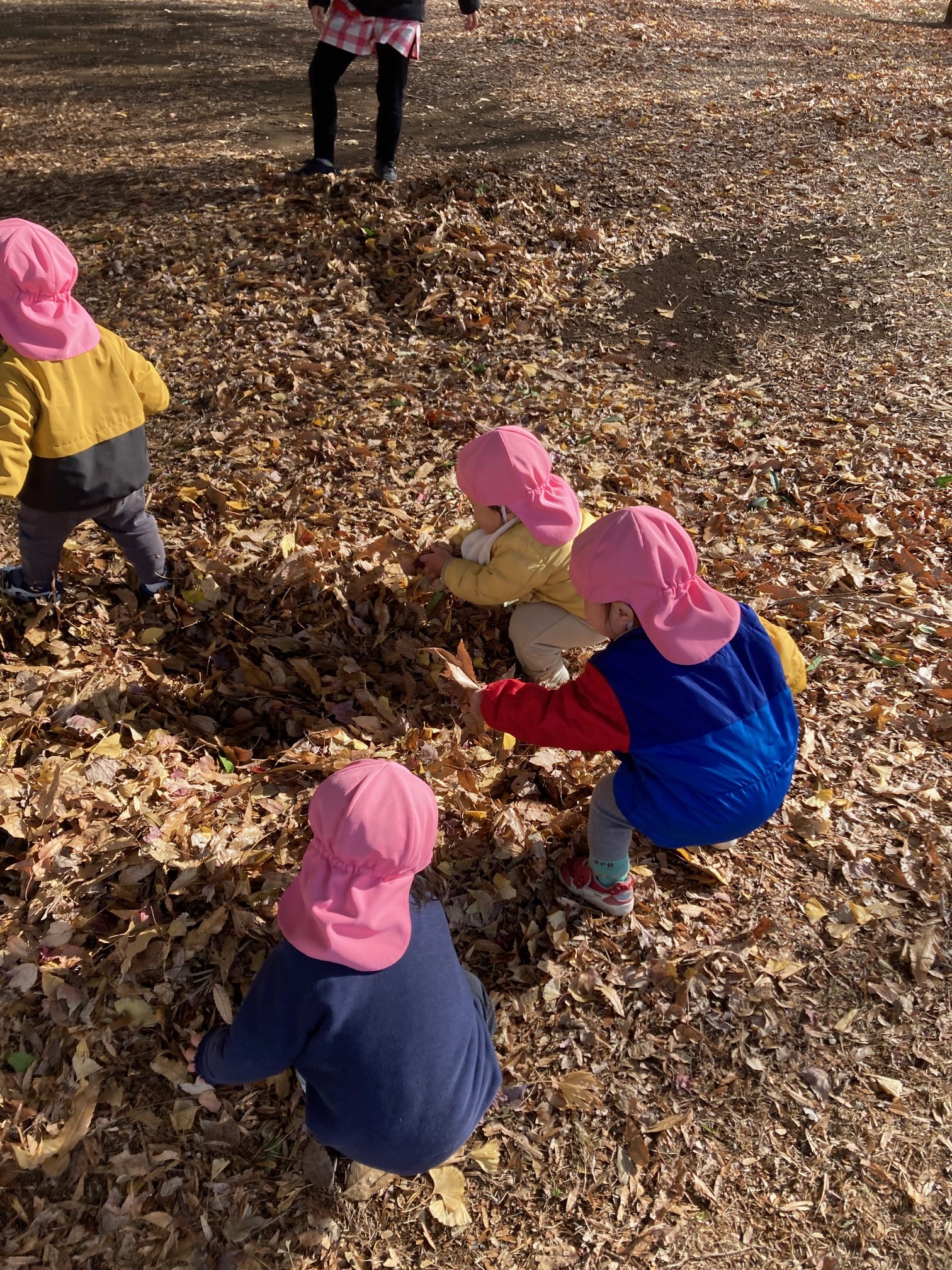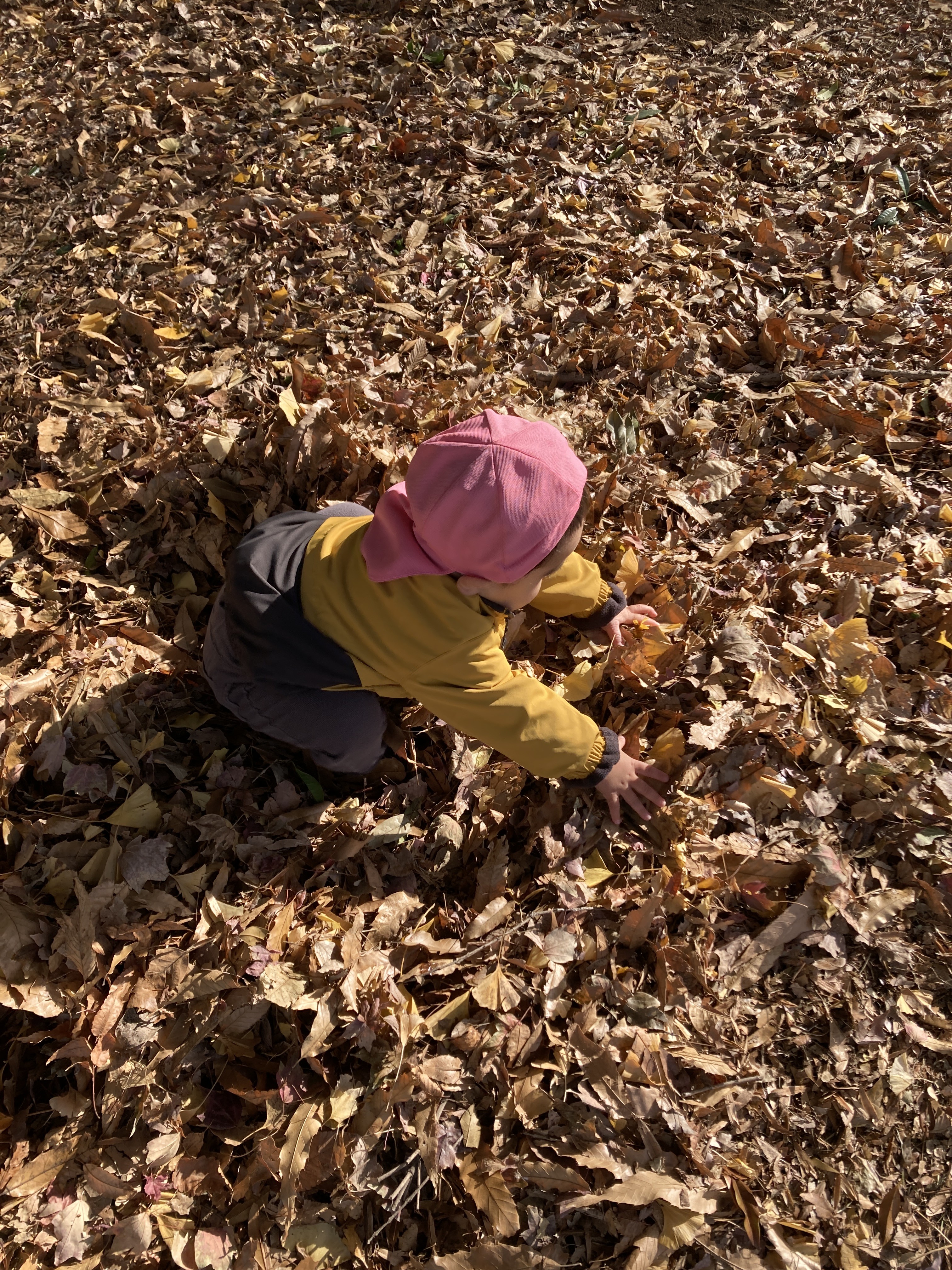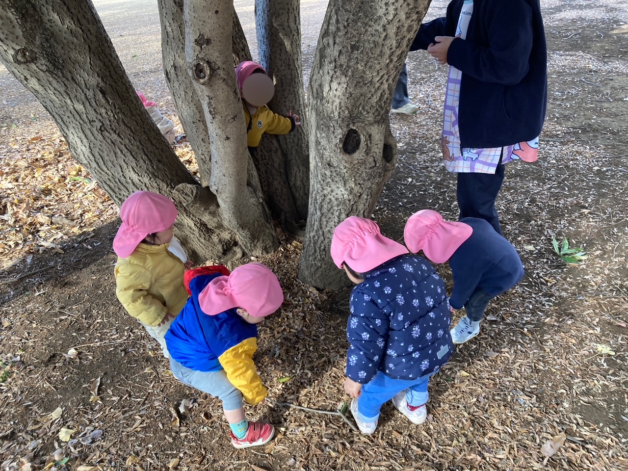 木の近くでドングリ探ししてたかと思ったら、”ここ通れるかも!”と気付いたお友だちの真似をして木の間を通り抜けして楽しそうに笑い合っていました。