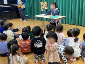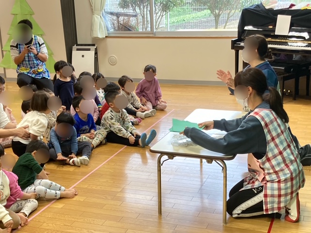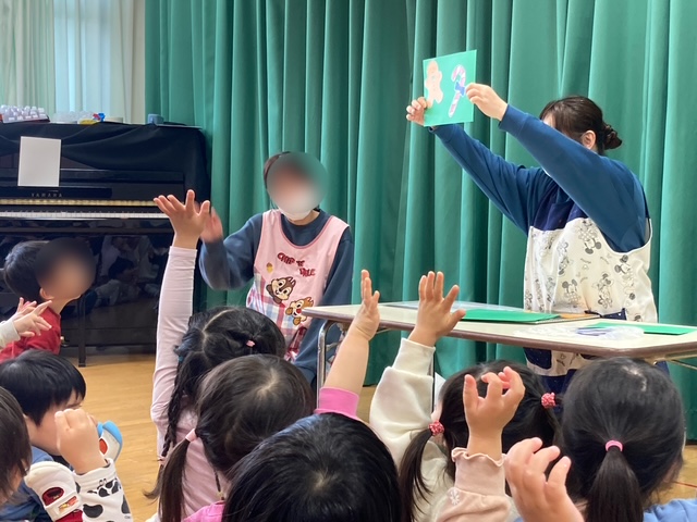 次にクリスマスツリーには何を飾る?クイズをしました。「お星様飾る!」と手を挙げたり「ケーキも飾りたいよね」と話していました。
