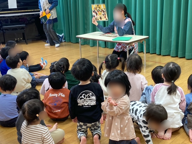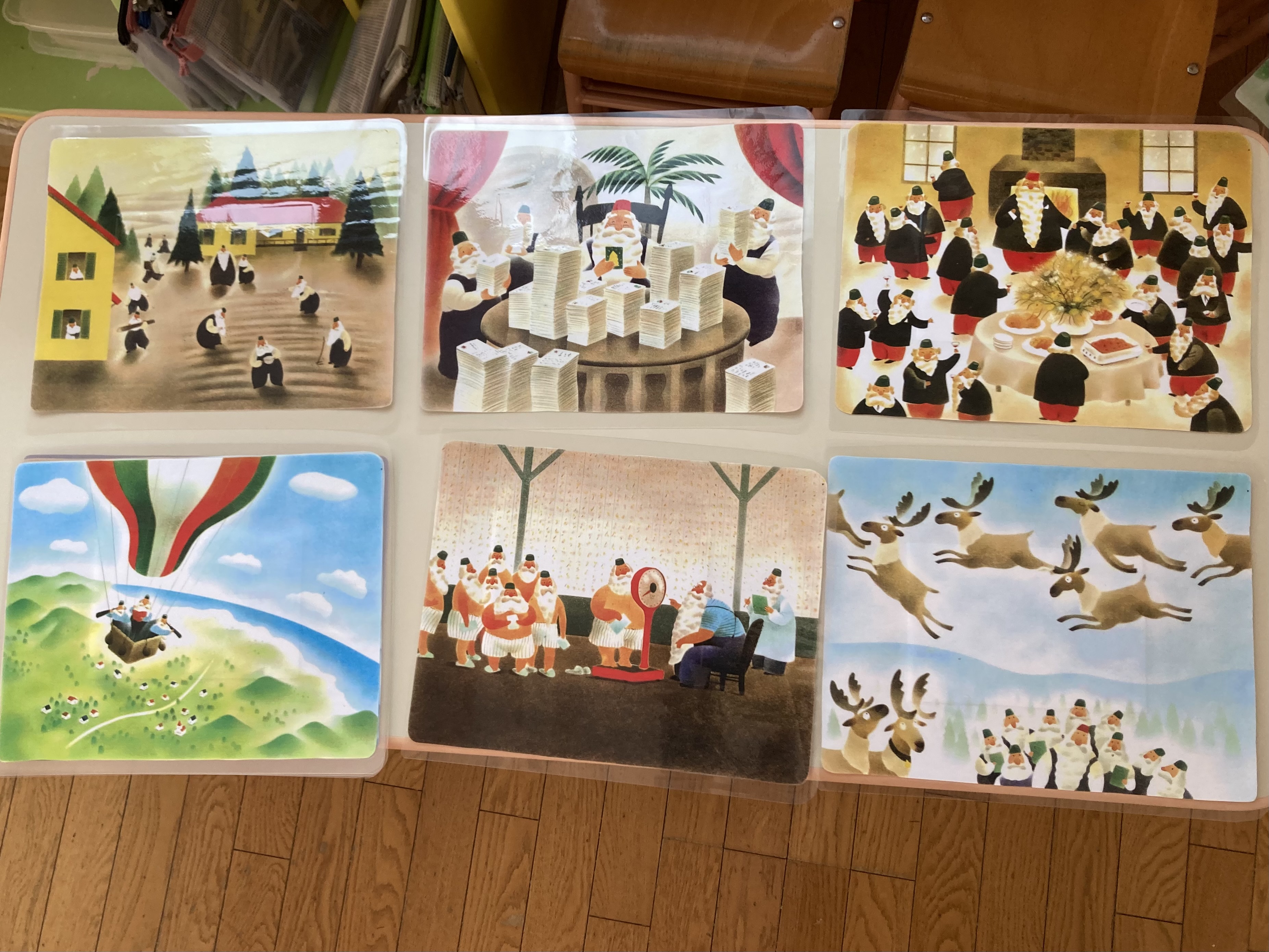 最初にサンタさんの1年のお話をすると真剣に見ている子もいれば