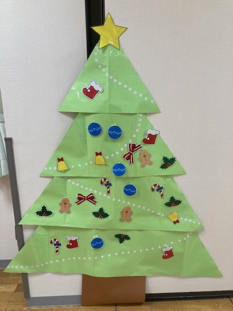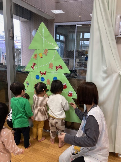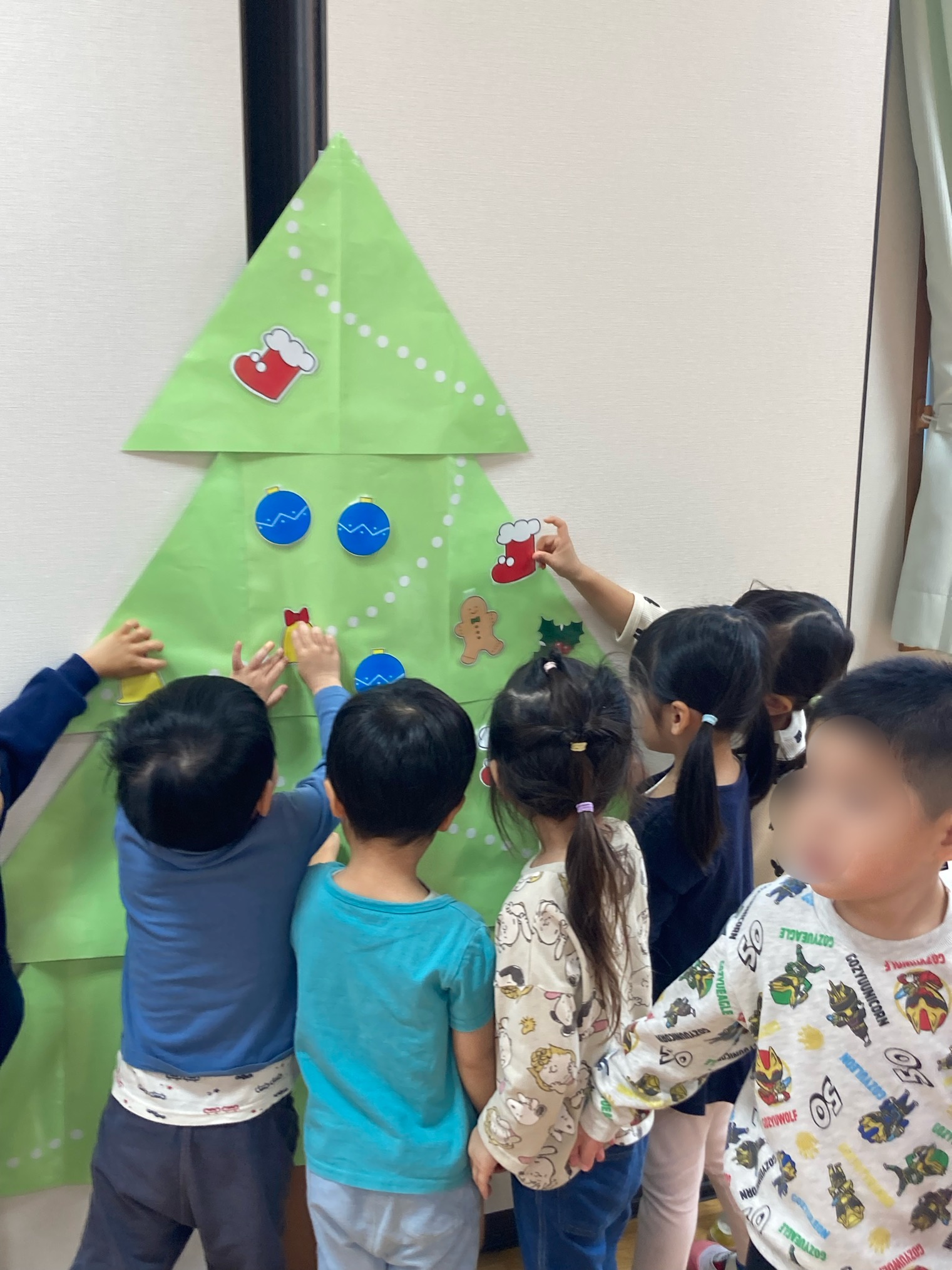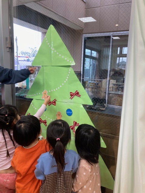 次にクリスマスツリーの飾り付けゲームをしました。「リボンがある」「クッキーだ!」と渡してもらった飾りを大切に貼って楽しみました。