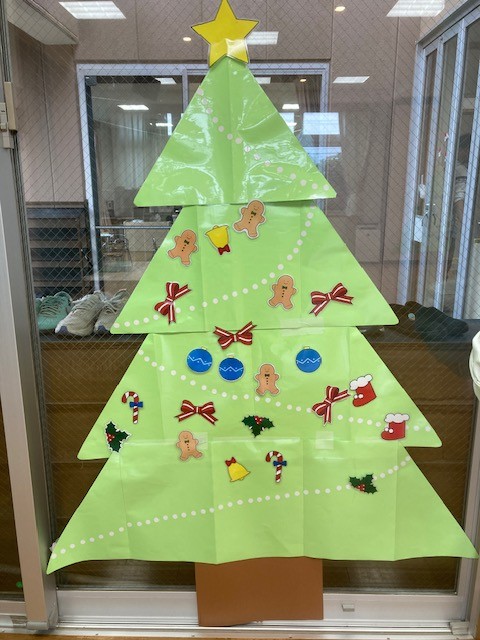 てっぺんのお星様は子どもたちと「どこに貼る?」と相談し、担任の先生たちが星を貼ると素敵なツリーが完成しました!