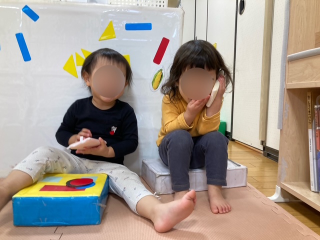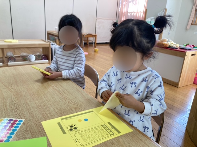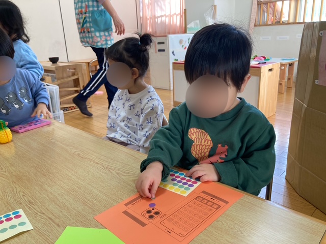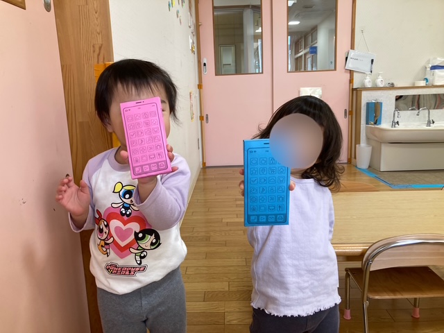 オリジナルのスマホが完成すると「できた!」「みて!スマホなの!」と大喜びして、お友だちや保育士に見せていました。