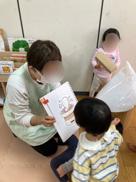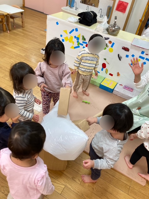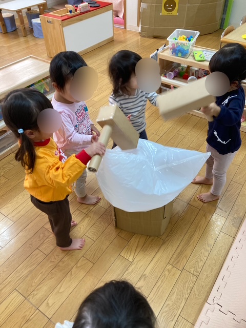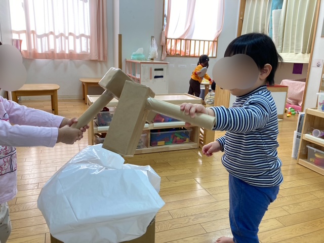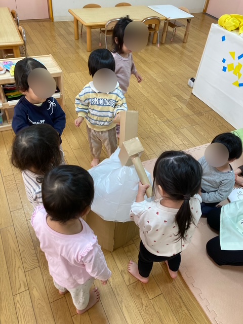 月1組のみんなは絵本に出てくる、おもちが大好きなので、お正月の雰囲気を味わってもらいたくて、餅つきをしました。