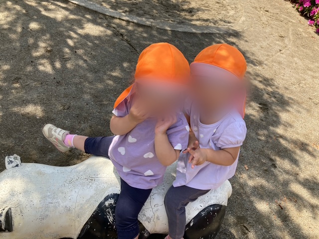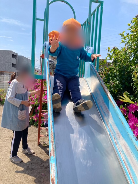 ブランコや滑り台等、遊具でたくさん遊びました。ブランコで揺れていると、隣にいる友達に「楽しいね!」と声を掛けていました。
