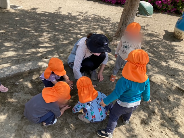 お水を飲んで休憩した後は、砂場遊びや虫探しをして過ごしました。