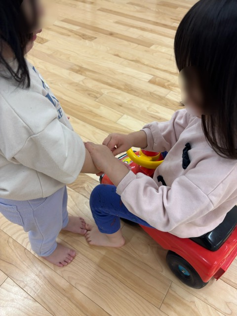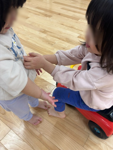 そんな中で、保育者が離れていった後に子ども同士でこんな様子がありました。