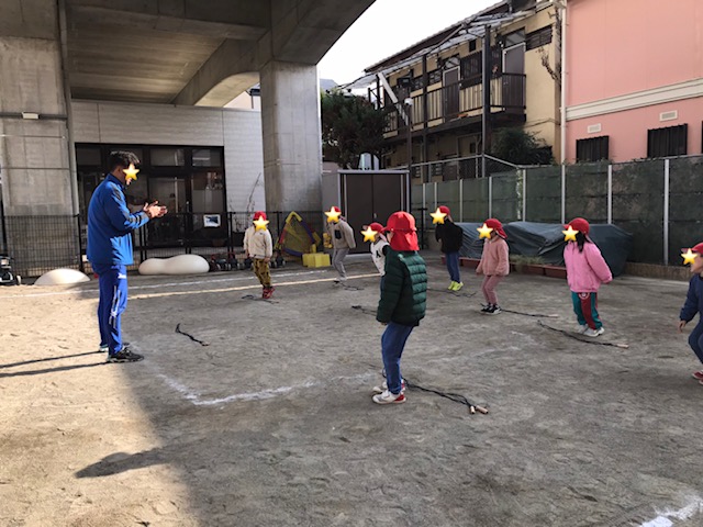 体育指導がありました。12月に入り、短縄に挑戦です。まずは縄を地面に置いてゲーム遊びをしました。音がなったらジャンプで飛び越えます。音をよく聞いて楽しそうにあそんでいました。