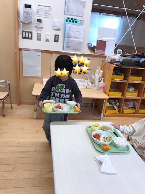 今日は初めてだったので、運ぶ練習をしました。慣れてきたら自分でお皿を取り、運ぶこともしていきます。
