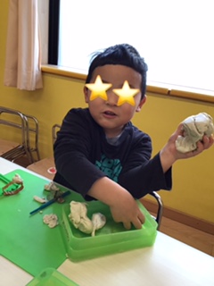 朝の集まりの後は子どもたちのリクエストで粘土遊びをしました。