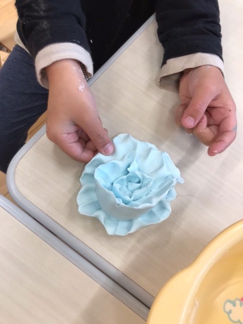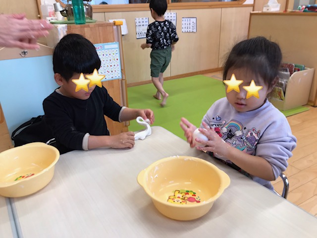 今日はドロドロの状態から固まるまで子どもたちで行いました。どうしたら固まるのか、フワフワの粘土になるのか、感触の変化を感じながら作ることができました。