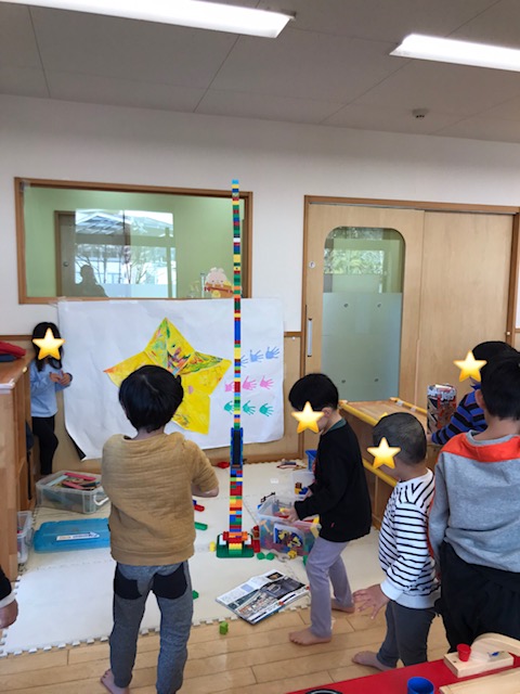 天井近くまで積み上げると「すごいね!」「えんちょうせんせいよりおおきいかな?」と嬉しそうな子どもたちでした。
