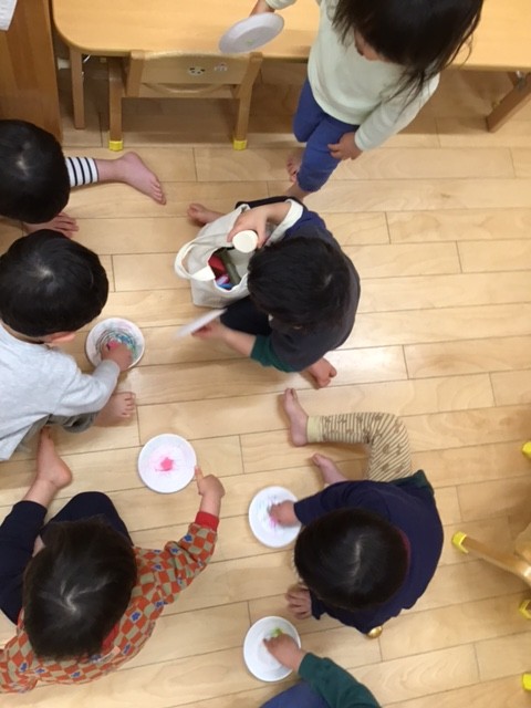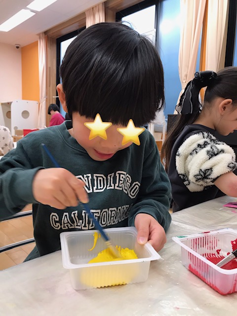 絵の具を使いました。絵の具を出すところから準備をしてもらいました。どのくらいの絵の具を出せばいいか考えながら慎重に行ったり、水の調整をして一生懸命溶かしていました。