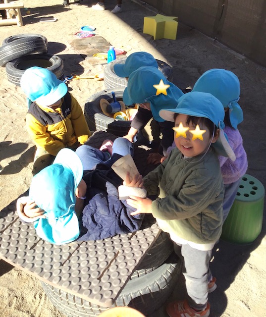 園庭ではお医者さんごっこ。ひとりの患者さんにたくさんのお医者さんがきて治療してくれていました。