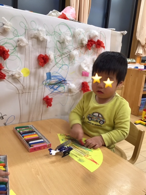 「おに〜のパンツはいいパンツ〜」と歌いながらクレヨンでぐるぐる描いていました。