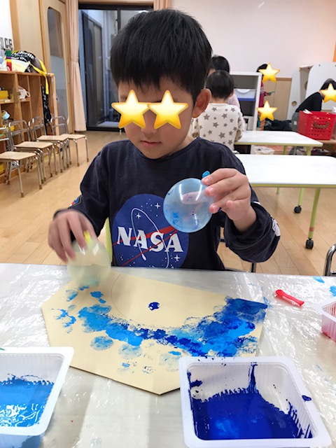 水風船を使って色をつけていきました。夏でたくさん遊んだ水風船を見て「え!今日これで制作するの!?」と驚く子どもたち。「夏にしかできないと思ってた!」と喜んでいました。