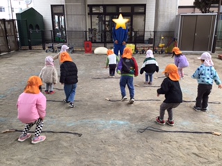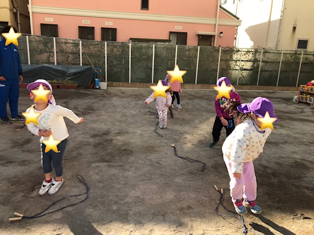 途中で暑くなり、上着を脱いで行う姿もありました。先月から園庭遊びや体育指導で縄跳びに挑戦していたので上手になった姿を講師の先生に見てもらい、嬉しそうな子どもたちです。