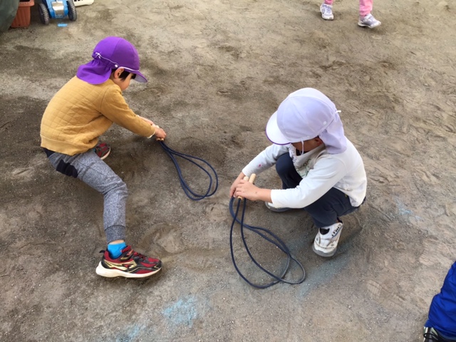 縄跳びの結び方を友達と一緒に行うすがたもみられました。