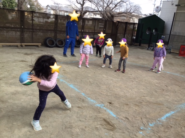 中当てをしました。ルールもわかってきて、逃げている側も投げる側も楽しんでいました。