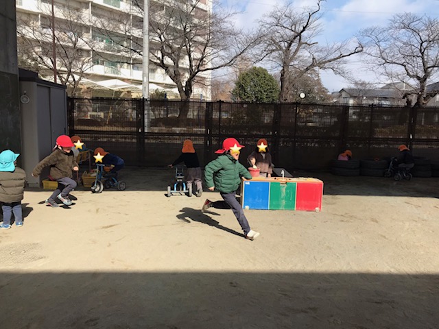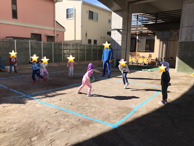 中当てでは、素早くボールを投げていました。「きゃー」と言いながら、逃げて楽しんでいました。