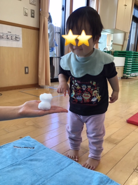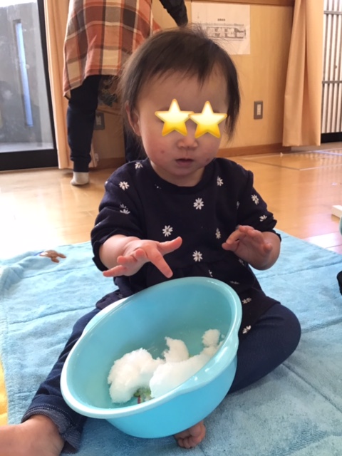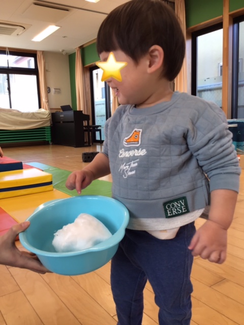 今週始めはまだ雪が残っている所もあり、外から雪を持ってきて触って遊びました。