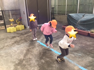 体育指導の準備運動のジャンプでは、つま先でジャンプをして、さらにグーパーにして進んでいます。