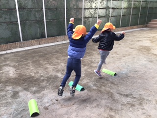 園庭遊びの時にサーキット遊びをしました。フラフープをジャンプして、バケツをジグザグに通っていきます。