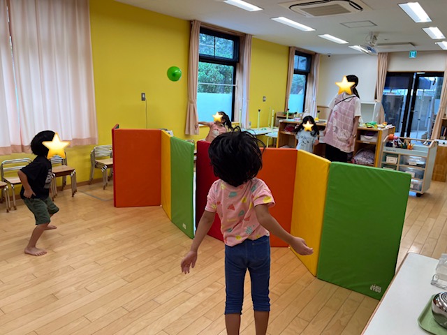 お部屋を広くしてゲームスタートです。 ゲームでは相手の場所に風船を飛ばす際にはお友達と力を合わせました。 今日も元気いっぱいなにじ組の子どもたちでした。