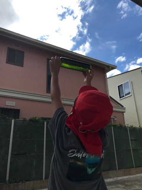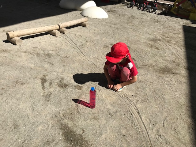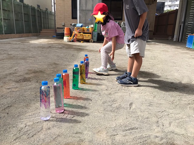 新しい砂場玩具に漏斗があったので、以前遊んだ色を塗ったペットボトルに色水を入れて遊びました。太陽に当たると色がうつるのを発見。