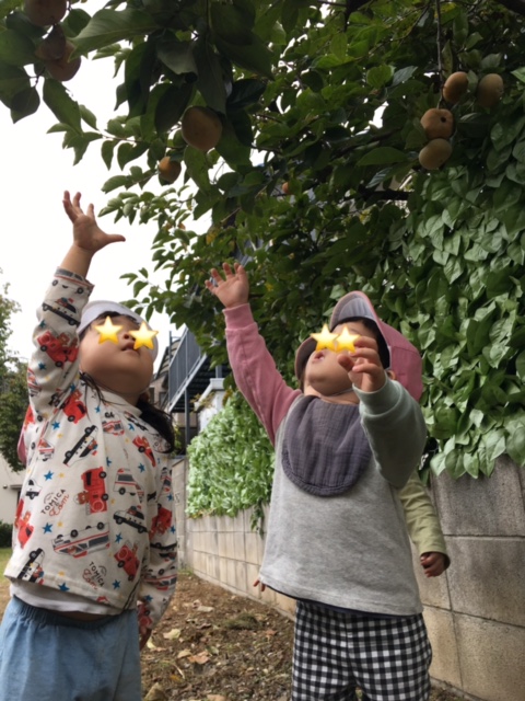 柿の実が沢山なっていて背伸びをして触ろうと頑張っていました。