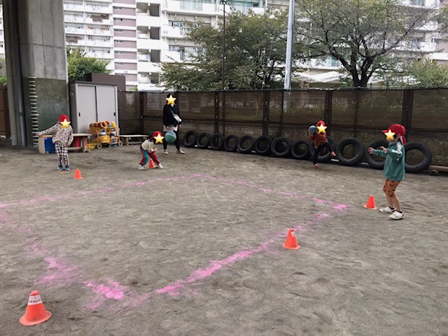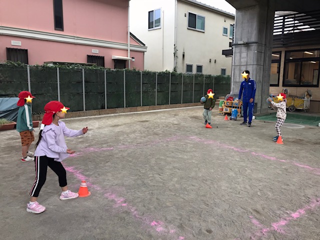 準備体操で体を温めたあと、園庭でボール運動をしました。
