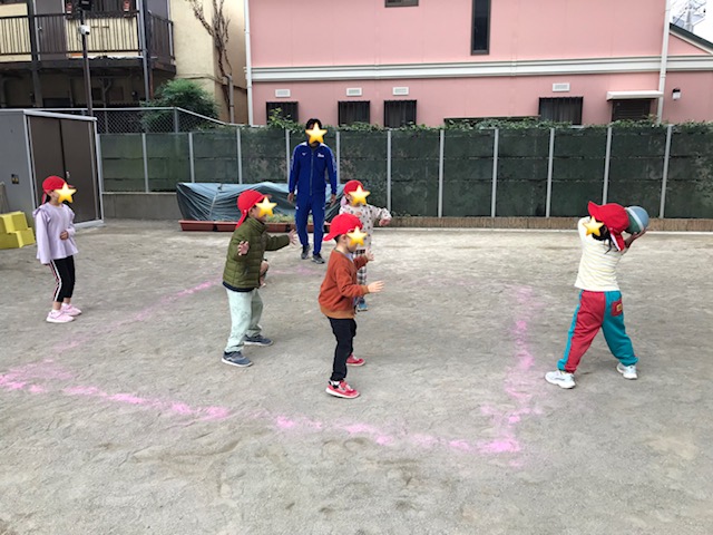 当たると外野と交代。逃げるだけでなくボールをキャッチしたり、スピードアップしながら周りをよく見てゲームを楽しんでいました。