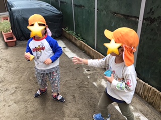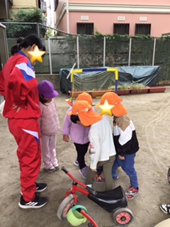 園庭では職場体験のお姉さんと一緒に鬼ごっこの鬼決めをしていました。みんな足を合わせています。