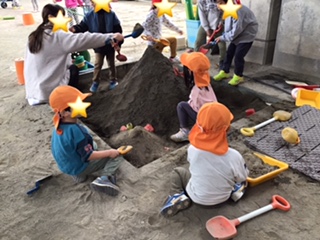 砂場では大きな山づくりをしていました。大きな山の横に小さい山も作っています。