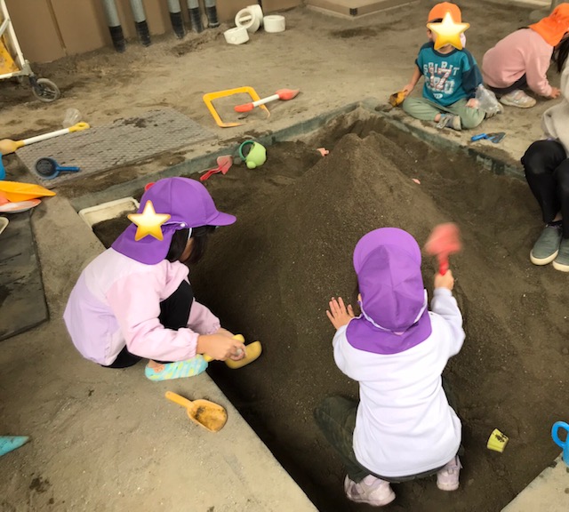視力検査の後は園庭で遊びました。 砂場ではお友達と一緒に山を作っていました。 「もっとたかく!」「どんどんすなかけて!」と大きい山ができていましたよ。