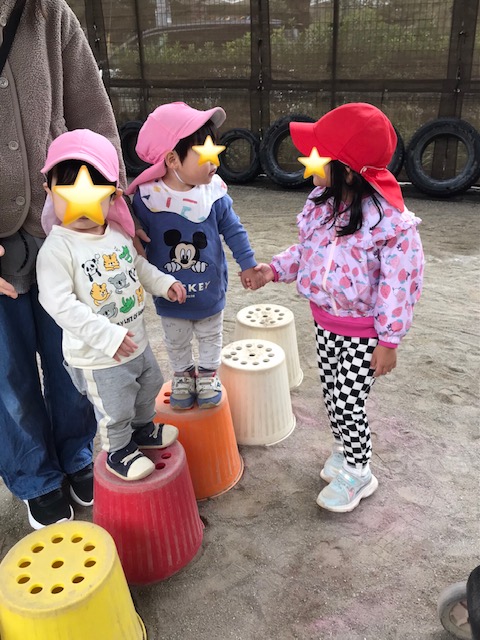 園庭に出ると先に遊んでいたうさぎ組の友達に声をかけて遊び始めました。