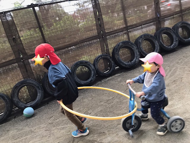 一緒に手を繋いだり、三輪車を引っ張ったり。 優しく声をかけながら小さな友達のペースも考えて遊んでいます。