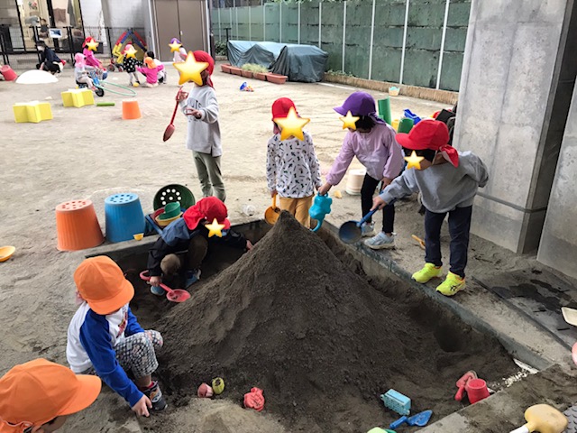 砂場ではほし組にじ組の友達と大きなお山作りも。友達同士で役割分担をして砂を乗せる人、トンネルを掘る人と話し合いながら決めていました。